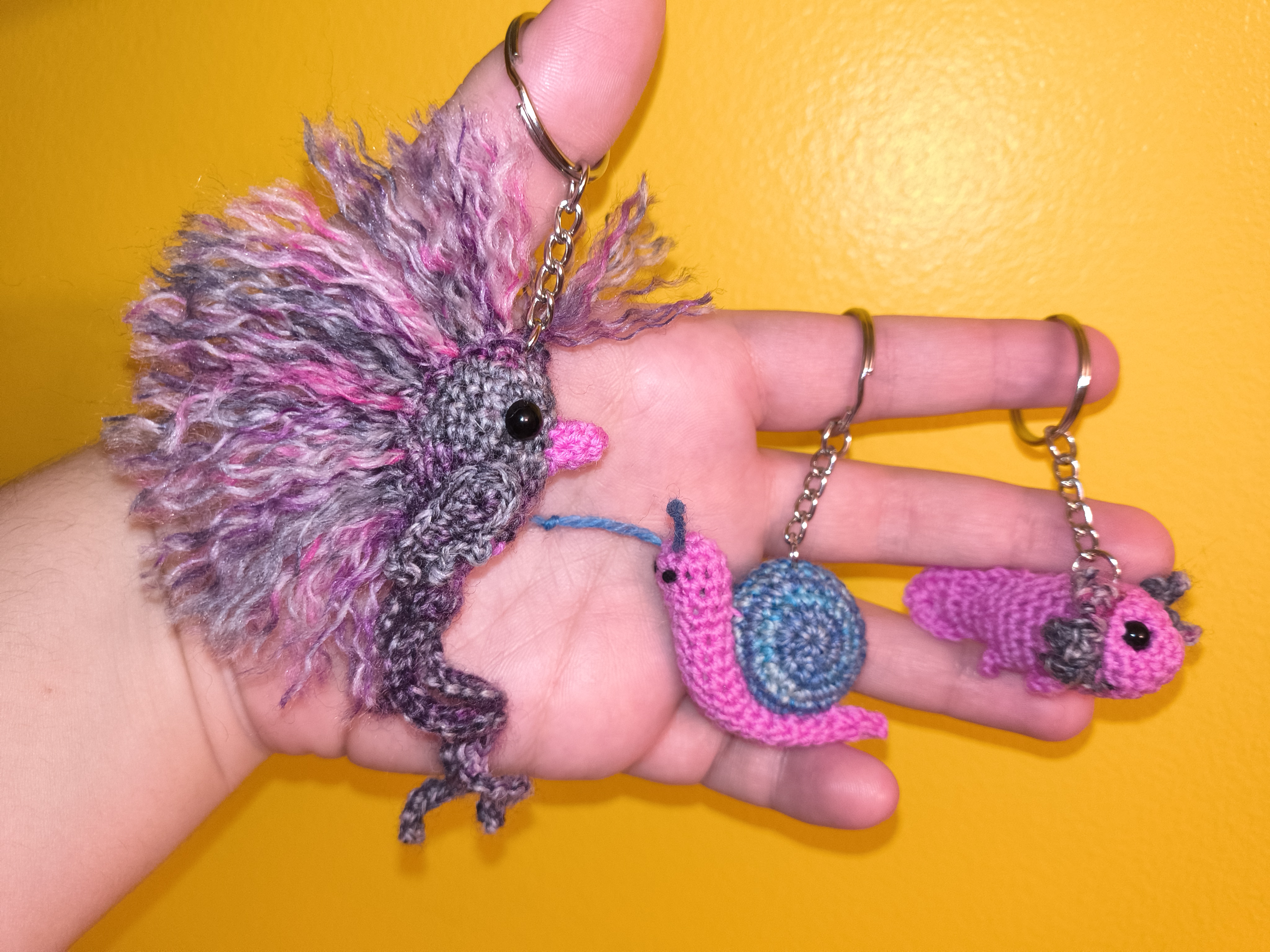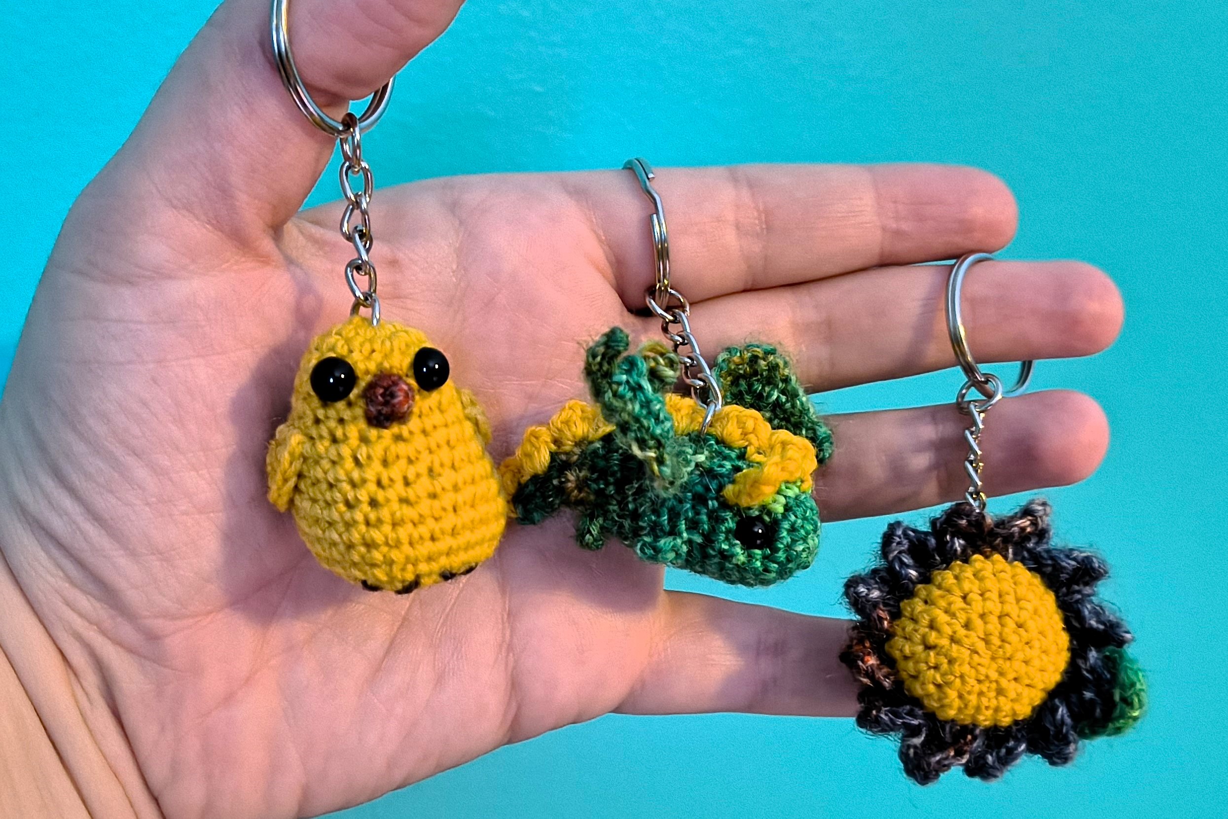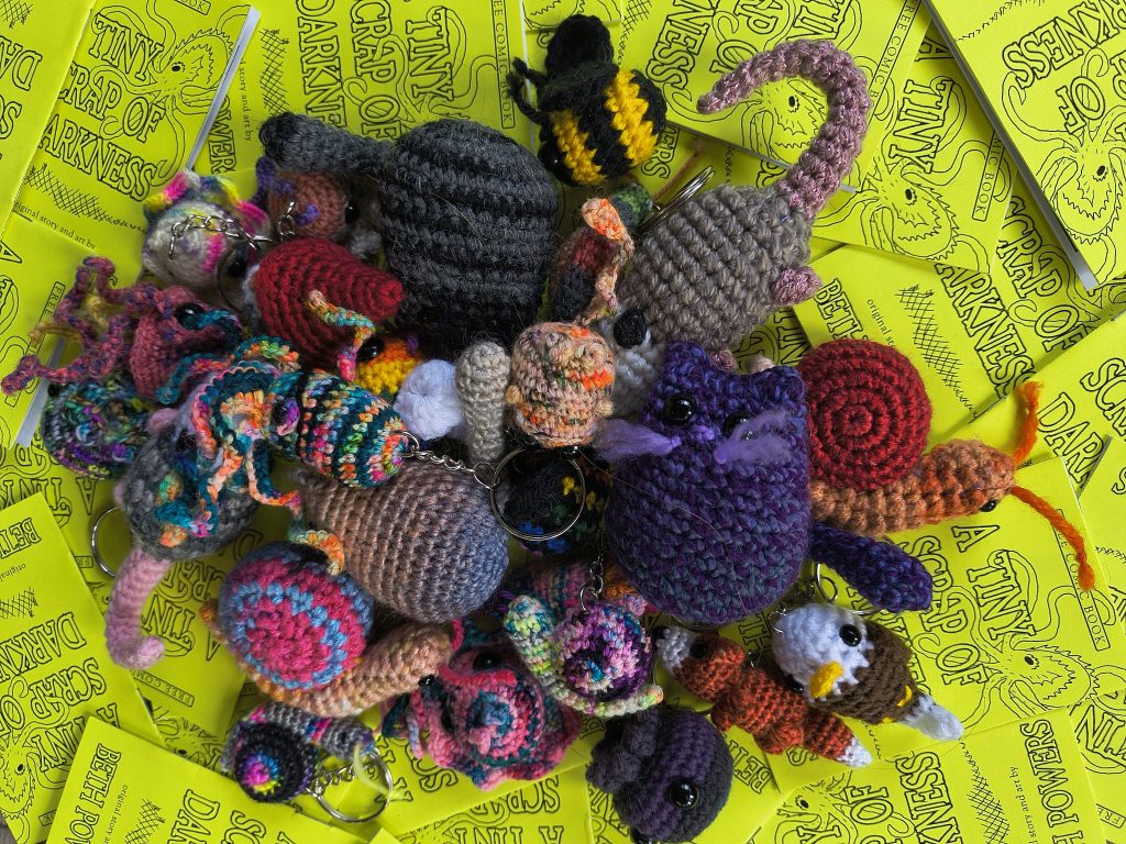 I’ll have a table with my sci-fi and fantasy story collections, art items (more about those below), and lots and lots of crochet critters! I’ve been working on some new displays–I had them at my last event, but we’ve made improvements to the keychain displays, and they now hold even more keychains, which means you get even more to chose from 🙂