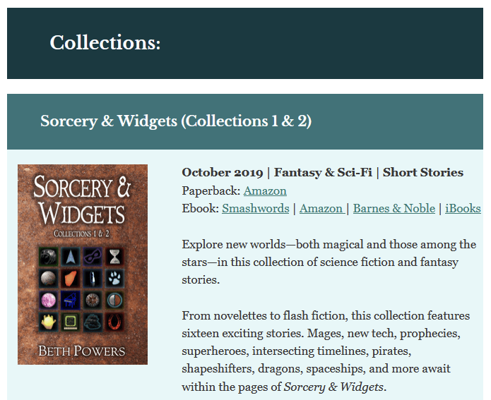 I’ve been working on revising my “Stories” pages, so that they are easier to follow (hopefully!). Instead of several different versions of the page, there is now a main “Stories” page, which includes all of the collections, stories, descriptions, links to bookstores, and cover art. The other page is a “Printable Story List” page, which includes the highlights for each story in a more compact format and without the cover art. This page would work better if you want to print a checklist of stories to read or the images are slow to load.