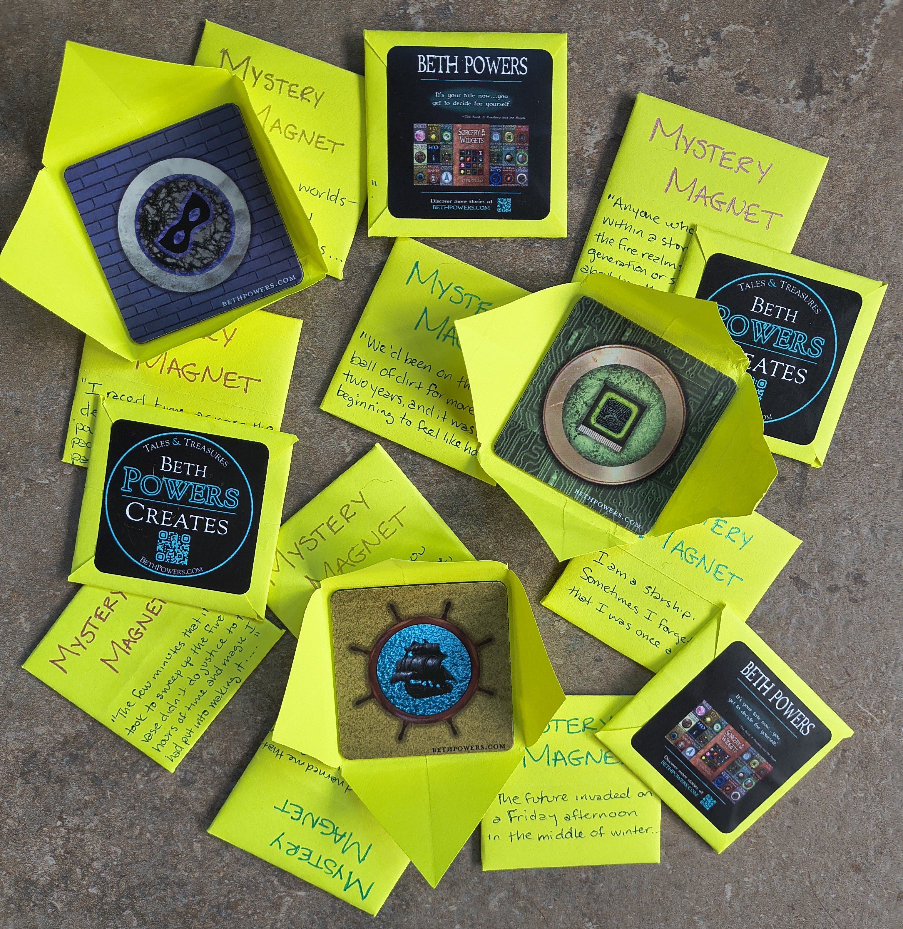 If you enjoy surprises, blind bags, and mystery items (like I do), then you now have the option to buy a mystery magnet. Each magnet has the cover art from one of my stories, and the package has a quote from the story on the outside, giving you a clue as to what the art on the magnet might be, but it’s still a mystery which one you will get!