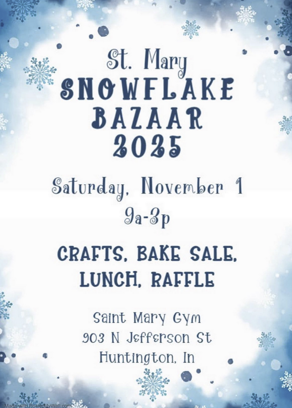 I just signed up for this one–I’ll be at the St. Mary Snowflake Bazaar on Saturday, November 1st from 9 a.m. to 3 p.m. It’s in the Saint Mary’s Church Gym (903 N. Jefferson Street) in Huntington, Indiana, and has crafts, a bake sale, lunch, and a raffle!