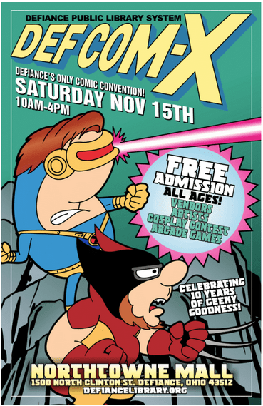 On November 15th, I’ll be in Defiance, Ohio at Def-Com X (in the Northtowne Mall) from 10 a.m. to 4 p.m. Def-Com is a mini comic con put on by the Defiance Public Library, and looks like it will be a fun time!