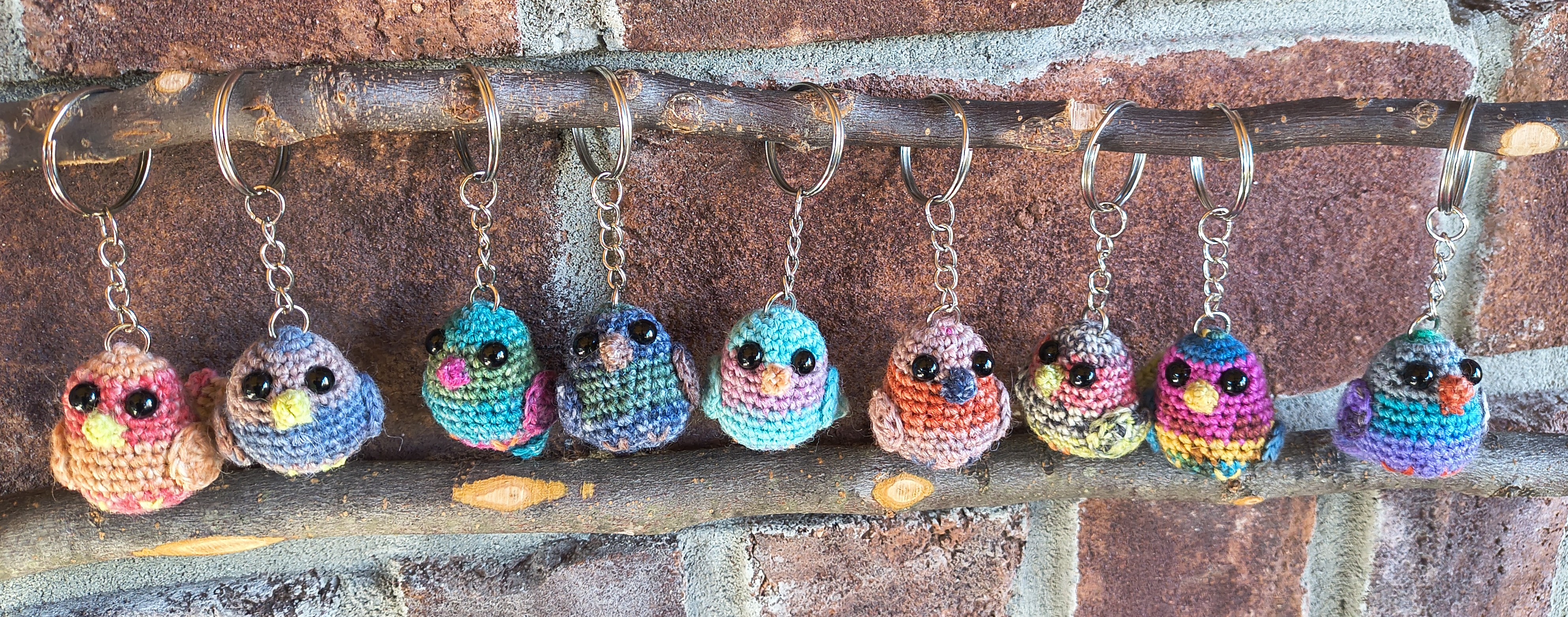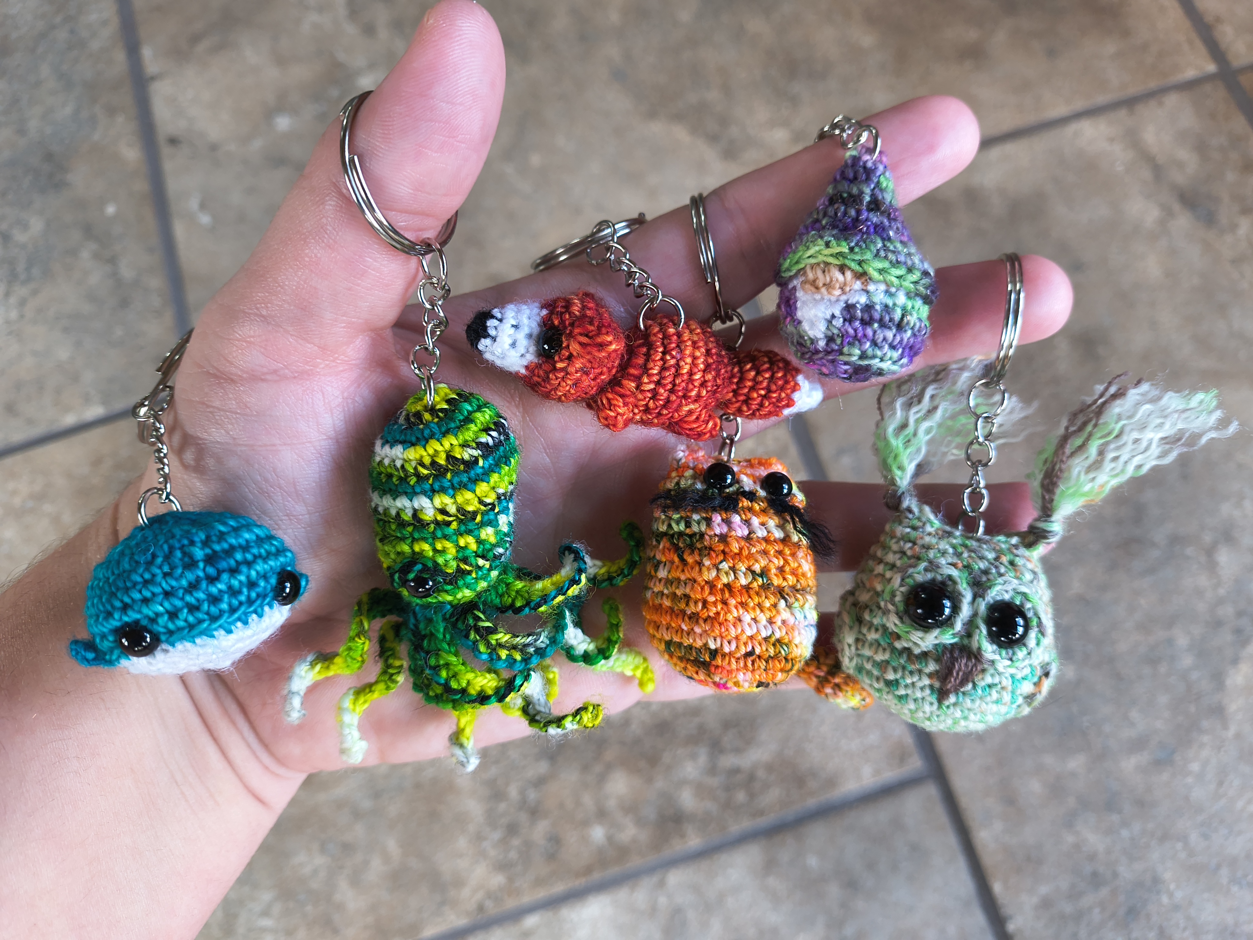 I’ve replenished my supply of keychain birds–a few of these have already found new homes, but there are still plenty of colorful ones left. The bright handful of critters below them represent just a sampling of keychains that I’ve made with my new sock yarn from Simply Socks Yarn Company in Fort Wayne. And finally, my first kiwi (made with the pattern in Quirky Amigurumi by Alleshen Hamilton) was so popular that I made several more in different sizes!