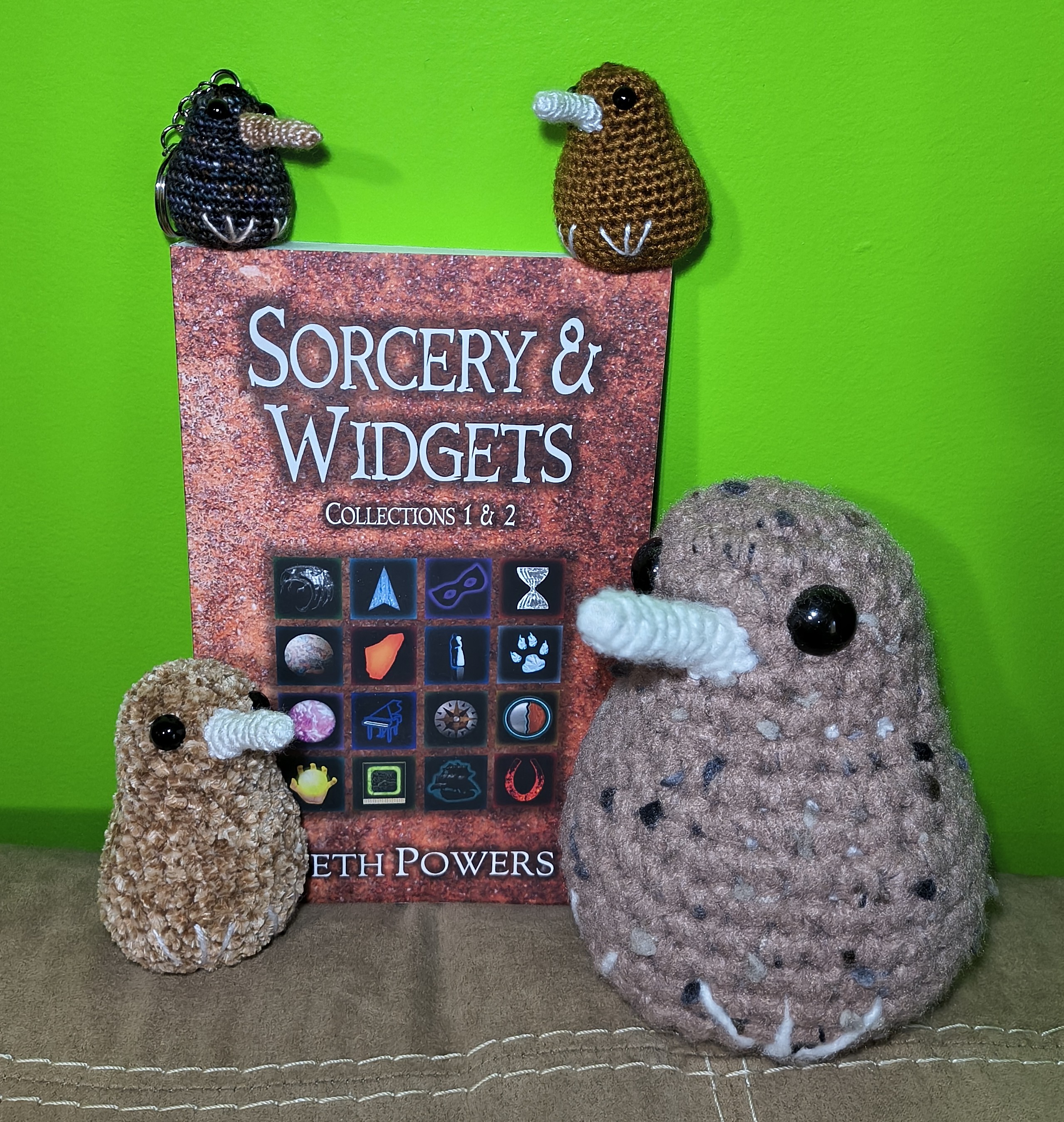 If you’re looking for something new to read this summer, stop by Half-Price Books in Fort Wayne (533 E Coliseum Blvd) this Saturday, June 21st between 1 p.m. and 3 p.m. I’ll be signing and selling copies of both of my story collections, Sorcery & Widgets and Runes & Rivets. Plus, I’ll have my art items and lots of critters as well! I made a new version of my mini comic book, “A Tiny Scrap of Darkness”–you can see it in the background here along with many of the critters that I’ve made since my last event. A few of these have already found homes, but I’m hoping to finish a few new ones this week. You’ll have to stop by to see them all!