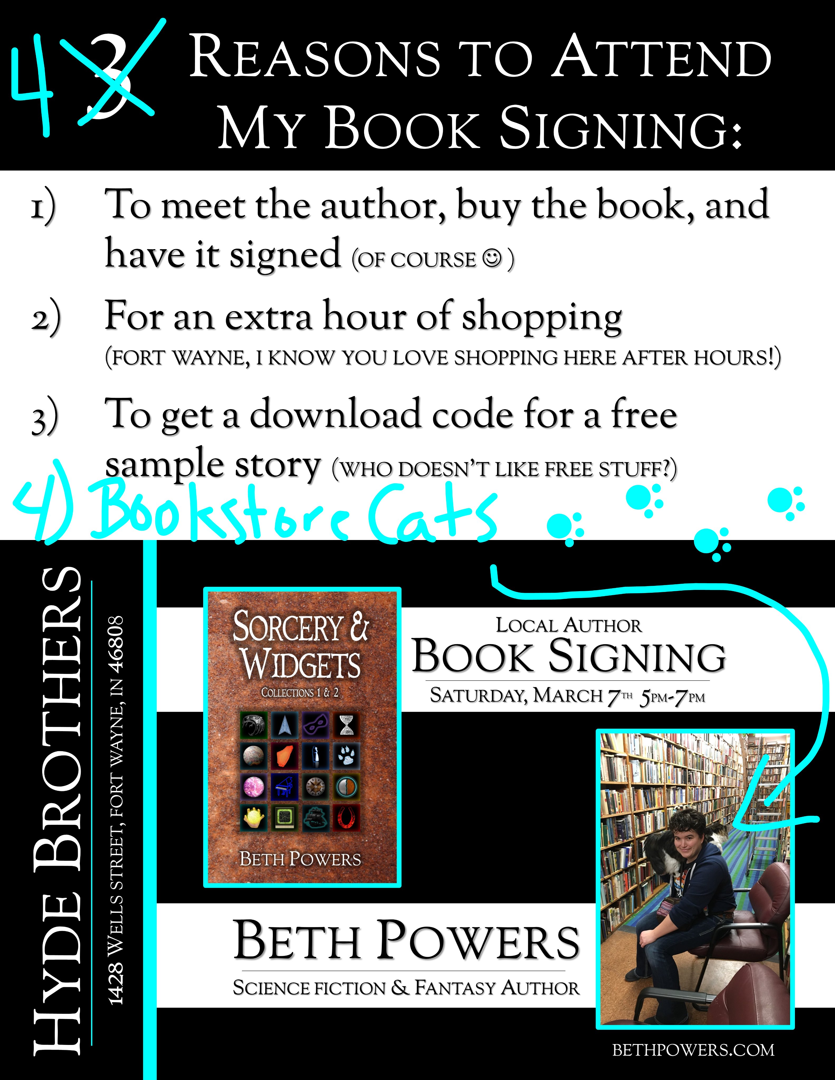 If you enjoy the ebook version and want to get a signed copy of the print version, you’re in luck! I’ll be at Hyde Brothers in Fort Wayne, Indiana on March 7th from 5pm-7pm signing books. Feel free to stop in to buy a copy of your own or just to say hi (to me or the bookstore cats) and check out the store!