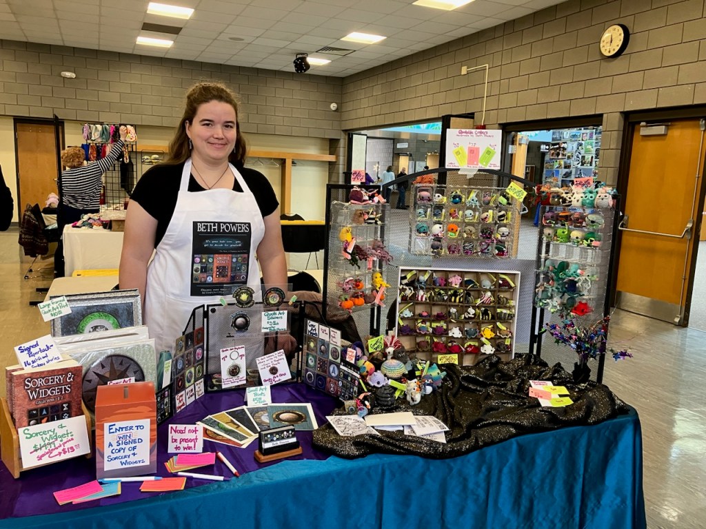 I made a banner for my table–here’s a picture of a recent event without the banner and one with it. I’m hoping that it will make it easier for you to spot my table at these upcoming events!