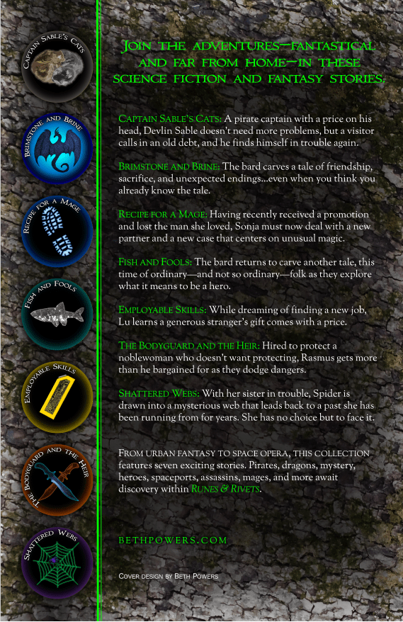 Runes & Rivets includes seven stories–three of them have been previously published, while the other four are brand new! Most of them have connections, either in terms of characters or worlds, to some of my other stories. I’m still waiting for my copies to arrive, but assuming they make it on time, I’ll have Runes & Rivets for sale, along with Sorcery & Widgets, at both of my fall events. I’ll leave you with the back cover (text below the image) to tell you a little about the stories: