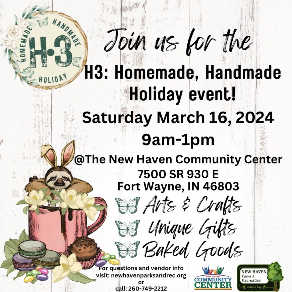 New Haven is having another H3: Homemade, Handmade, Holiday event on March 16, 2024 from 9 a.m. to 1 p.m. at the New Haven Community Center (7500 SR 930 E, Fort Wayne, Indiana 46803). It’s still a few months away, but I wanted to mention it so that you can mark your calendars!